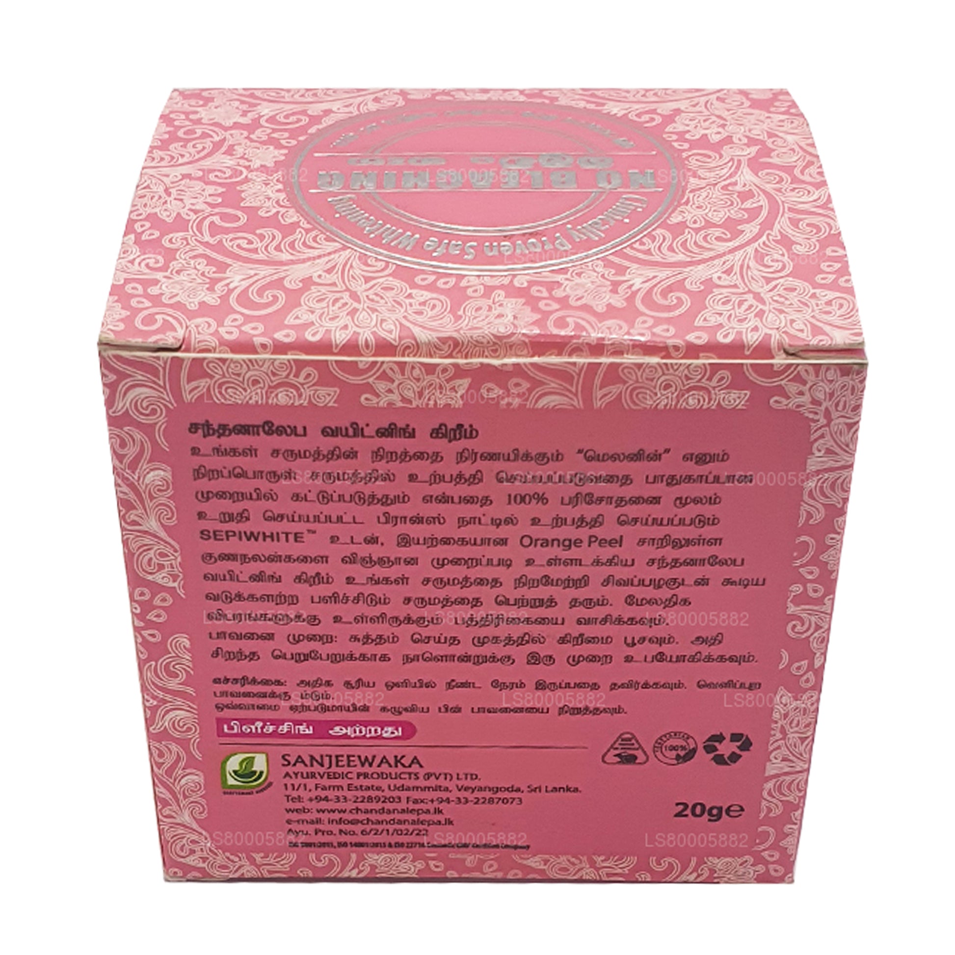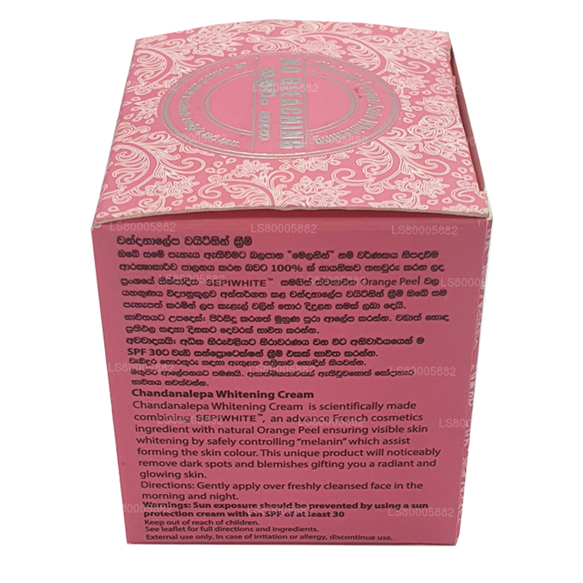 (Артикул: LS80005882) Отбеливающий крем Chandanalepa создан на основе научных исследований. Сочетание передового ингредиента французской косметики SEPIWHITE TM и натуральной апельсиновой корки обеспечивает заметное отбеливание кожи, безопасно контролируя уровень «меланина», способствующего формированию цвета кожи. Этот уникальный продукт заметно удалит темные пятна и пятна, подарит вам сияющую и сияющую кожу.