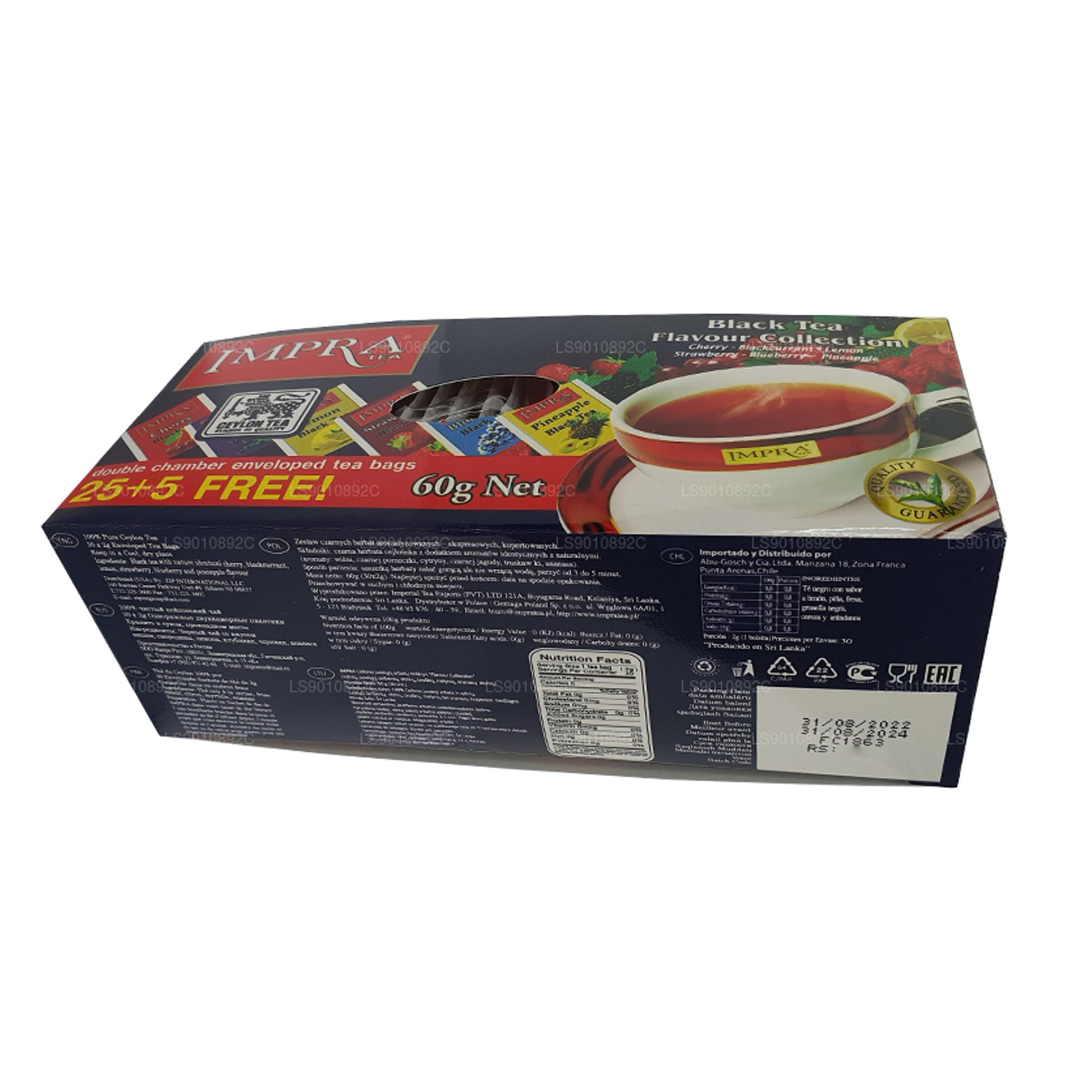 В коллекции Impra Black Tea Flavor представлено множество разнообразных вкусов, искусно сочетающихся с богатым ароматом цейлонского черного чая. Этот набор весом 60 г включает 30 двухкамерных чайных пакетиков с такими ароматами, как вишня, черная смородина, черника, лимон и ананас. Каждый вкус выбран по своему уникальному вкусу: в нем сочетаются сладкие, острые и освежающие нотки, которые превращают каждую чашку в незабываемое путешествие. Эта коллекция, идеально подходящая для любителей чая, желающих попробовать различные сорта фруктового чая, предлагает чай премиум-класса, сочетающий в себе как классические, так и экзотические вкусы