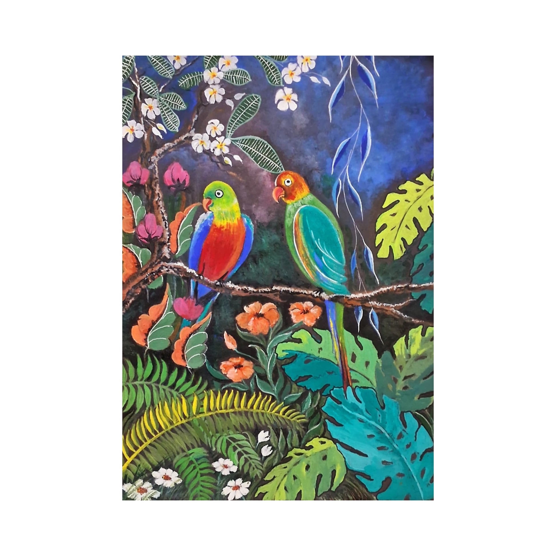 Lakpura® Птицы в лесу настенное искусство привнесет в ваш дом яркую красоту природы. На ней изображены две ярко окрашенные птицы, сидящие на ветке среди пышной зелени и цветов. Эта акриловая картина на холсте передает живую сущность тропического леса. Картина оформлена в паспарту, что придает ей элегантный вид и подчеркивает насыщенность ярких цветов и тончайшие детали. Это произведение искусства добавит свежести и естественности любой комнате, воспевая гармонию между дикой природой и окружающей средой.