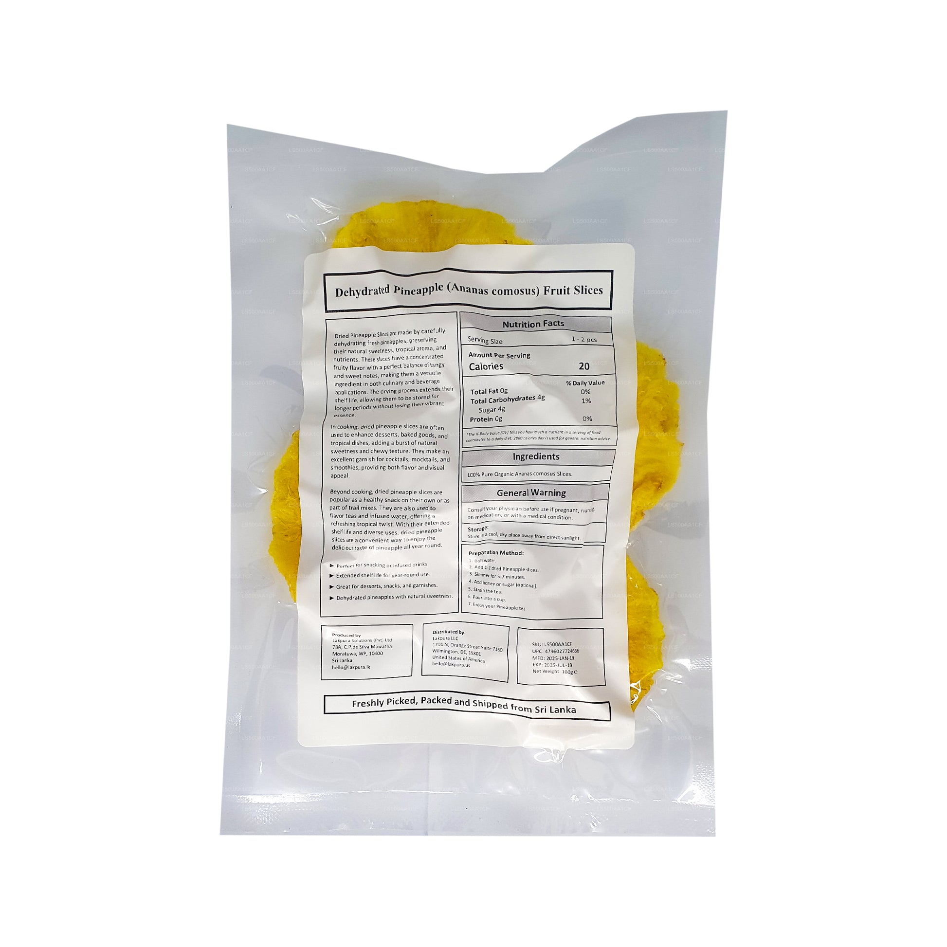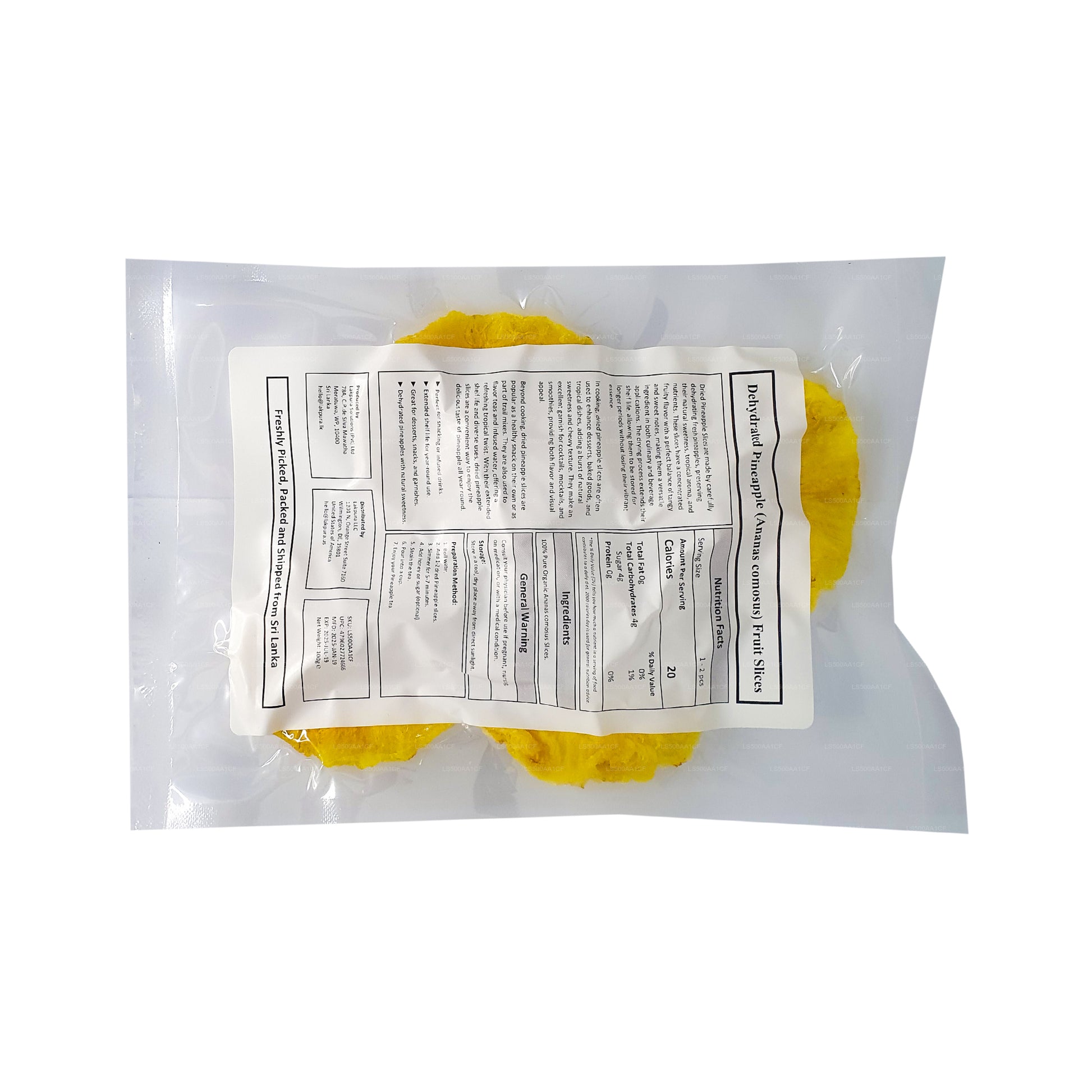 Наши обезвоженные натуральные кусочки ананаса Lakpura, обещающие вам 100% ананаса и не более того, станут отличной закуской для всех возрастов. Кусочки не содержат добавленного сахара, а мы заверяем вас, что в них нет искусственных ароматизаторов и красителей, что делает их питательным дополнением к вашему рациону. Эти сушеные ломтики ананаса собирают до идеальной спелости и обезвоживают при низких температурах, чтобы сохранить питательную ценность и истинный цвет
