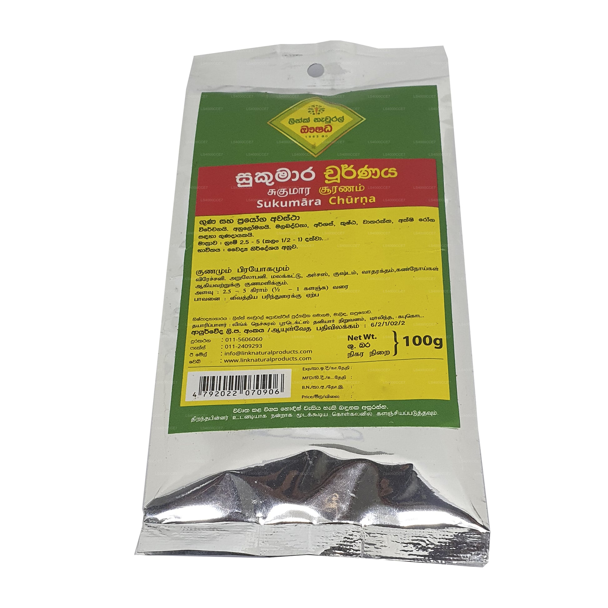 Link Sukumara Choorna — это аюрведический травяной порошок, разработанный для поддержания здоровья женщин и улучшения менструального и репродуктивного здоровья. Он содержит смесь таких трав, как ашока, лодхра, шатавари, дашамула, гудучи и трифала. Эта смесь предназначена для регулирования менструального цикла, облегчения таких неприятных ощущений, как судороги, баланса гормонов и поддержания общего репродуктивного здоровья