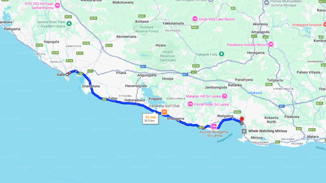 You will be picked from your hotel in Galle at 5.25 am and driven to Mirissa in an air-conditioned vehicle. The journey from Galle to the Mirissa Harbour takes approximately 1 hour 5 minutes while the boat will depart from the harbour at exactly 6.30 am. The whale watching tour lasts for 4 hours from and to the harbour while you will be spending 1 hour at the site where the whales are mostly visible to the naked eye. The entire tour duration will be 8 hours.